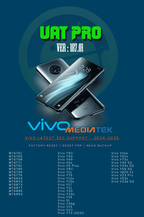 UAT PRO V187.01 [19-05-2025] Vivo Preloader Mode V5 latest Sec Support JOIN US ON TELEGRAM GROUP FOR HELP , SUPPORT AND DISCUSSION Official Web Shop ๐ฎ๐ณ Indian User can buy from here ๐ป PC CHANGE TIME IS 60 MINUTES ๐ AUTO API IS AVAILABLE FOR ALL DISTRIBUTORS AND RESELLERS ๐ค NEW RESELLERS ARE WELCOME UAT PRO Version : 187.01 Release Notes: Added V5 Exploit Vivo Mediatek Latest Sec Supported - Factory Reset | Reset FRP | Read Backup MT6761 [Helio A22] MT6765 [Helio P35] MT6768 [Helio P65] MT6771 [Helio P60] MT6781 [Helio G96] MT6785 [Helio G95] MT6799 [Helio X30] MT6779 [Helio P95] MT6833 [Dimensity 700] MT6853 [Dimensity 720] MT6873 [Dimensity 800/820 5G] MT6877 [Dimensity 900] MT6885 [Dimensity 1000+] MT6893 [Dimensity 9000] Vivo Y91i Vivo Y90 Vivo Y69 Vivo V5s Vivo V5 Plus Vivo Y81i Vivo Y1s Vivo Y75 Vivo Y12s Vivo Y15s Vivo Y17 Vivo Y21 Vivo Y30 Vivo Y33s Vivo Y19 Vivo S1 Vivo Y30g Vivo V15 Vivo V11i Vivo Y73 (2021) Vivo V21e Vivo Y52s Vivo Y73s Vivo Y30 5G Vivo Y33s 5G Vivo Y56 5G Vivo iQOO Z1 Vivo V23 Pro Vivo Y53s Vivo V23e 5G Easy to use, user friendly Interface , Unique GUI Tool D o w n l o a d L i n k Setup_UAT_PRO_187.01 http://uni-android.com/divider.png FTP SUPPORT AREA http://uni-android.com/divider.png -: Buy Now | Official Website :- Uni-Android Tool - Multi Platform Android Tool http://uni-android.com/divider.png -: Official Support : - Official Indian Support forum :- Uni-Android Tool Support Forum Official Shop for Indian Users := UAT PRO Shop India http://uni-android.com/divider.png -: Official Resellers :- Distributors and Resellers Lists http://uni-android.com/divider.png -: Official Telegram News Channel :- Telegram Channel :- https://t.me/UniAndroidTool http://uni-android.com/divider.png -: Official Telegram Help & Support Group :- Telegram Channel :- https://t.me/Uni_Android_Tool- EFT Pro Dongle V5.1.0 is released Remove Icloud Open Menu with Backup (FMI OFF)
