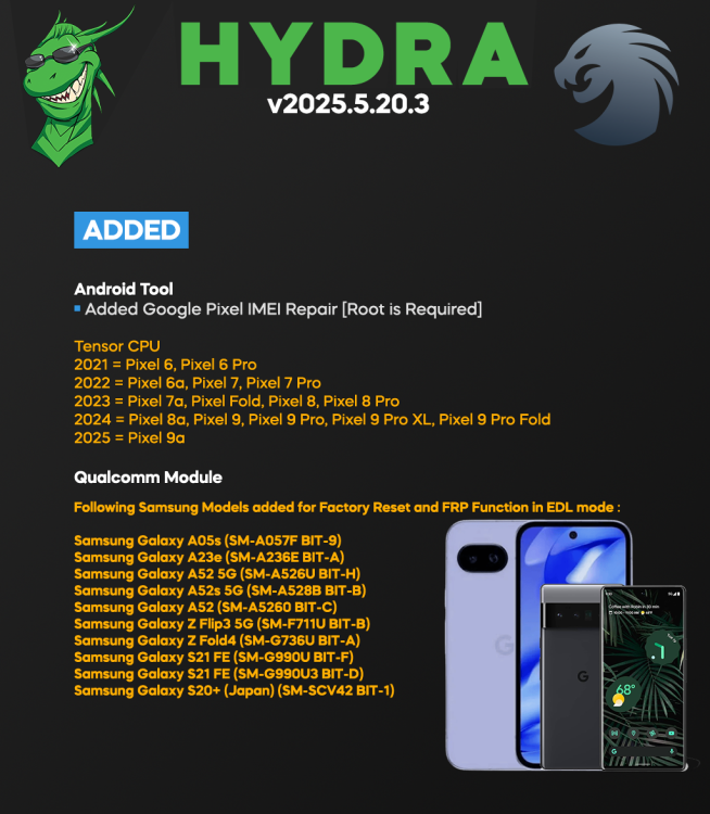 Hydra Tool v2025.5.20.3 Pixel Repair Security Functions and New Samsung Firehose [Android Module] -Added Google Pixel IMEI Repair [Root is Required] Tensor CPU 2021 = Pixel 6, Pixel 6 Pro 2022 = Pixel 6a, Pixel 7, Pixel 7 Pro 2023 = Pixel 7a, Pixel Fold, Pixel 8, Pixel 8 Pro 2024 = Pixel 8a, Pixel 9, Pixel 9 Pro, Pixel 9 Pro XL, Pixel 9 Pro Fold 2025 = Pixel 9a Following Samsung Models added for Factory Reset and FRP Function in EDL mode : Samsung Galaxy A05s (SM-A057F BIT-9) Samsung Galaxy A23e (SM-A236E BIT-A) Samsung Galaxy A52 5G (SM-A526U BIT-H) Samsung Galaxy A52s 5G (SM-A528B BIT-B) Samsung Galaxy A52 (SM-A5260 BIT-C) Samsung Galaxy Z Flip3 5G (SM-F711U BIT-B) Samsung Galaxy Z Fold4 (SM-G736U BIT-A) Samsung Galaxy S21 FE (SM-G990U BIT-F) Samsung Galaxy S21 FE (SM-G990U3 BIT-D) Samsung Galaxy S20+ (Japan) (SM-SCV42 BIT-1) HYDRA Tool - Powerful Advanced Complete- ๐๐จ๐๐ข๐ฅ๐๐๐๐ ๐๐๐ซ๐ฏ๐ข๐๐ ๐๐จ๐จ๐ฅ ๐๐.๐.๐ ๐๐๐ฅ๐๐๐ฌ๐๐ ๐๐๐ฒ ๐๐,๐๐๐๐